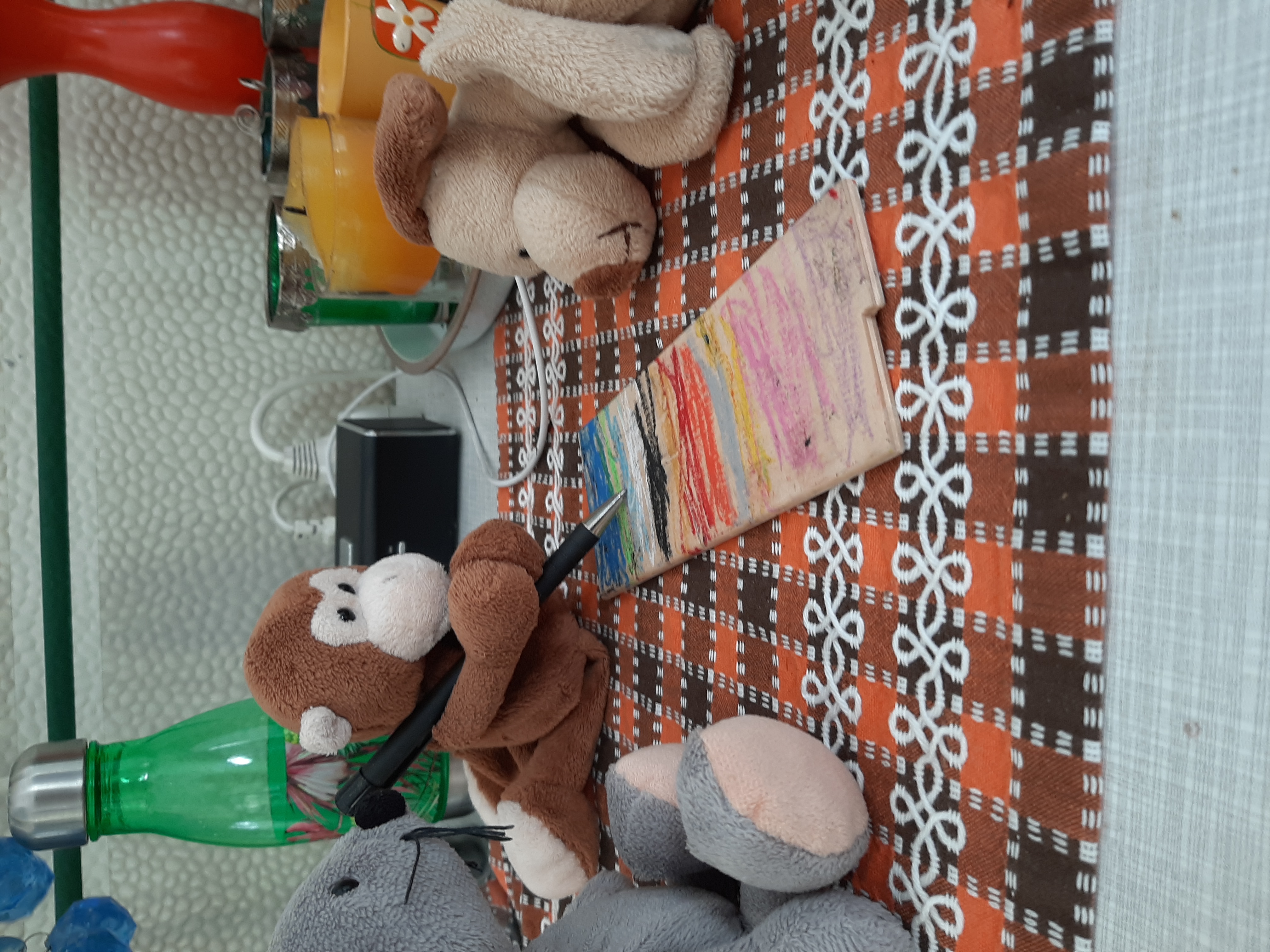 El Roy daarintegen kan heel mooi tekenen. Hij kan heel goed met kleuren omgaan en weet hele mooie tekeningen te maken. Hier zie je hoe hij een blokje hout mooier maakt met verschillende kleuren. Maar wacht eens even, ik ken dat gekleurde stukje hout... |