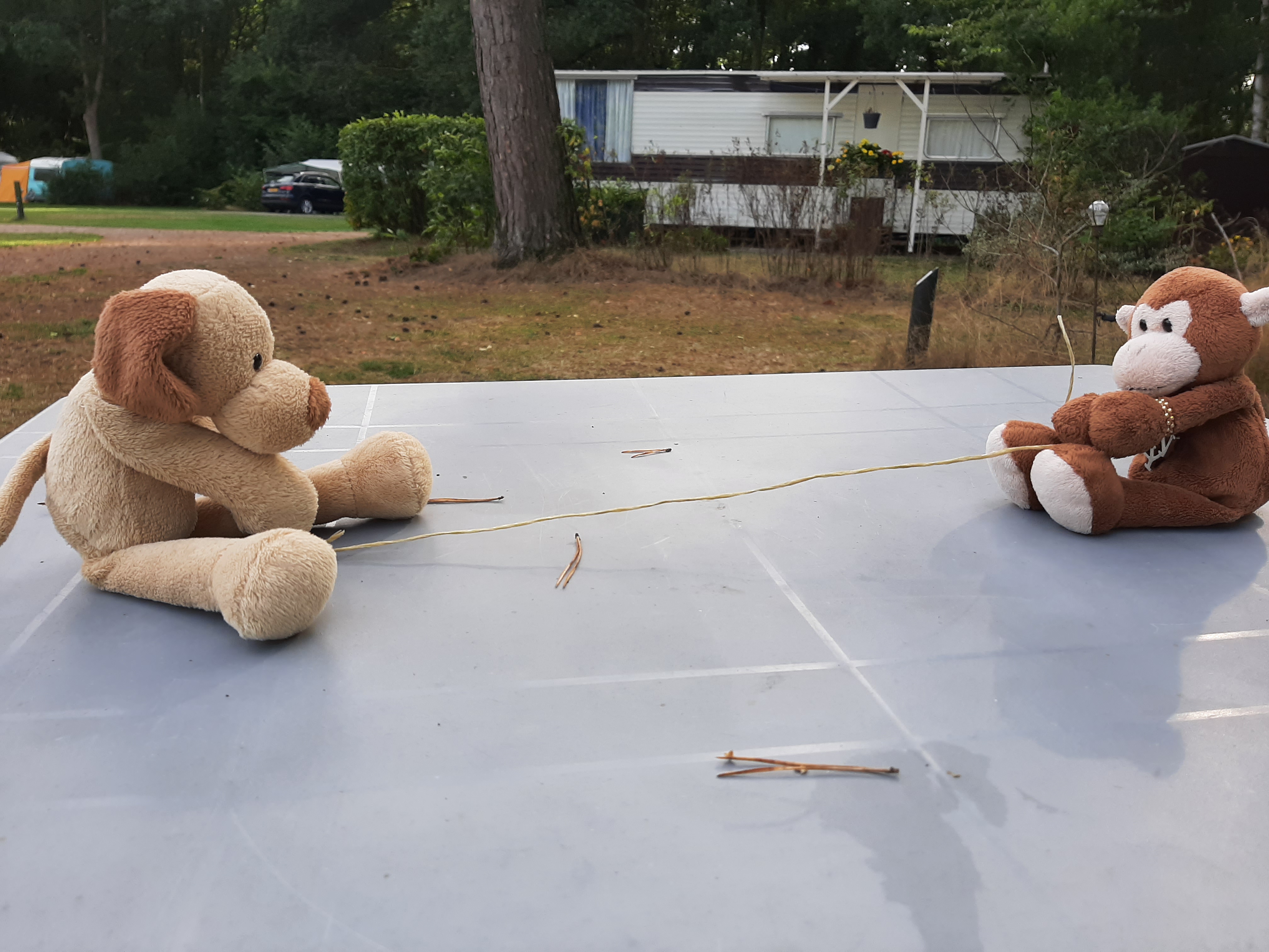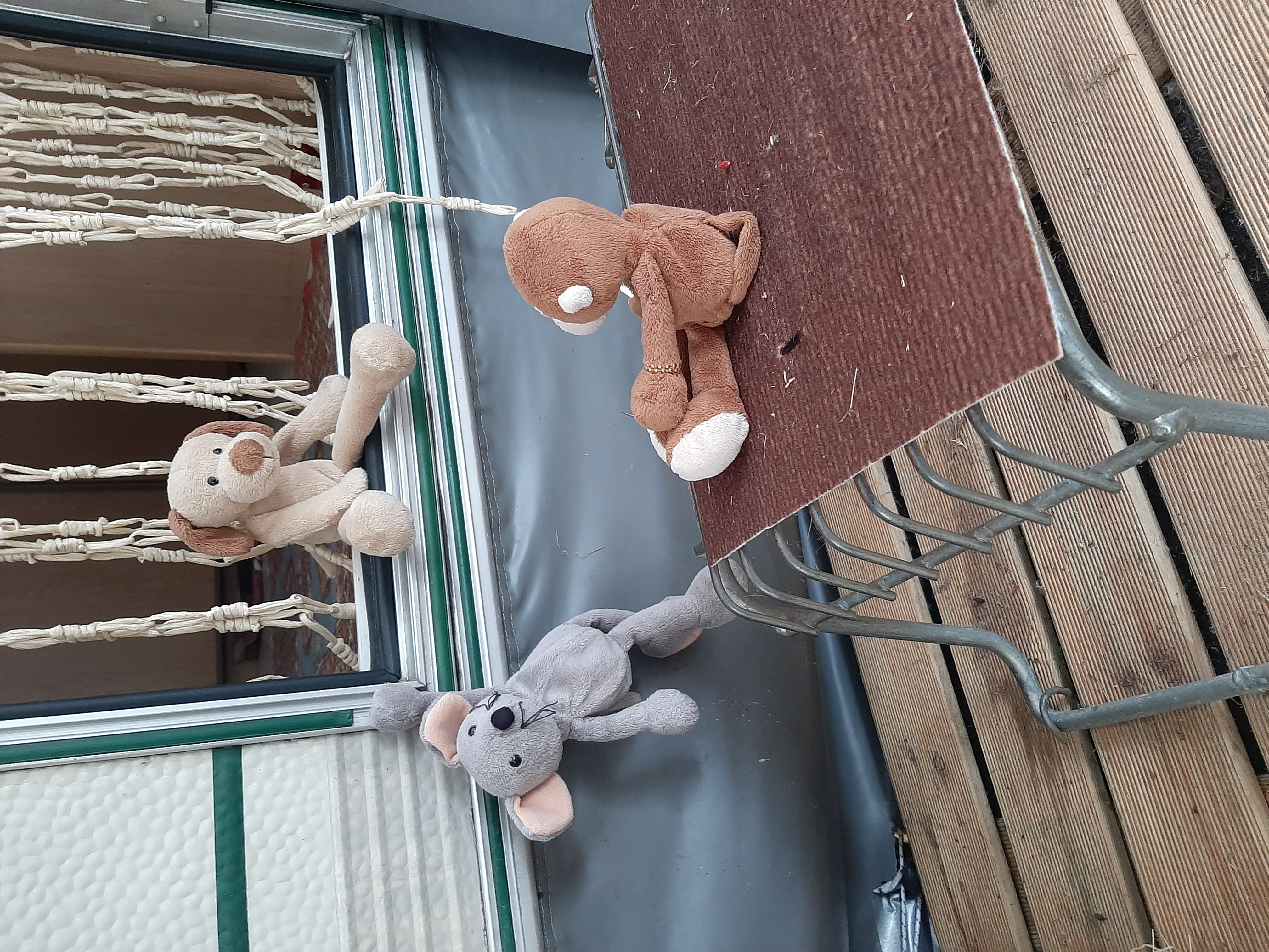 Als we bij de caravan aankomen, stappen de knufs naar binnen. Zij vegen eerst hun voetjes en stappen dan de caravan in. Ik vraag aan de knufs wat voor spelletje ze willen doen. "hangANDslinger, jaha dat willen we doen", zegt Sponzie. Ik zeg "dat is goed, maar wel voorzichtig aan..." En allemaal gaan ze de voortent in om hun plek te zoeken.