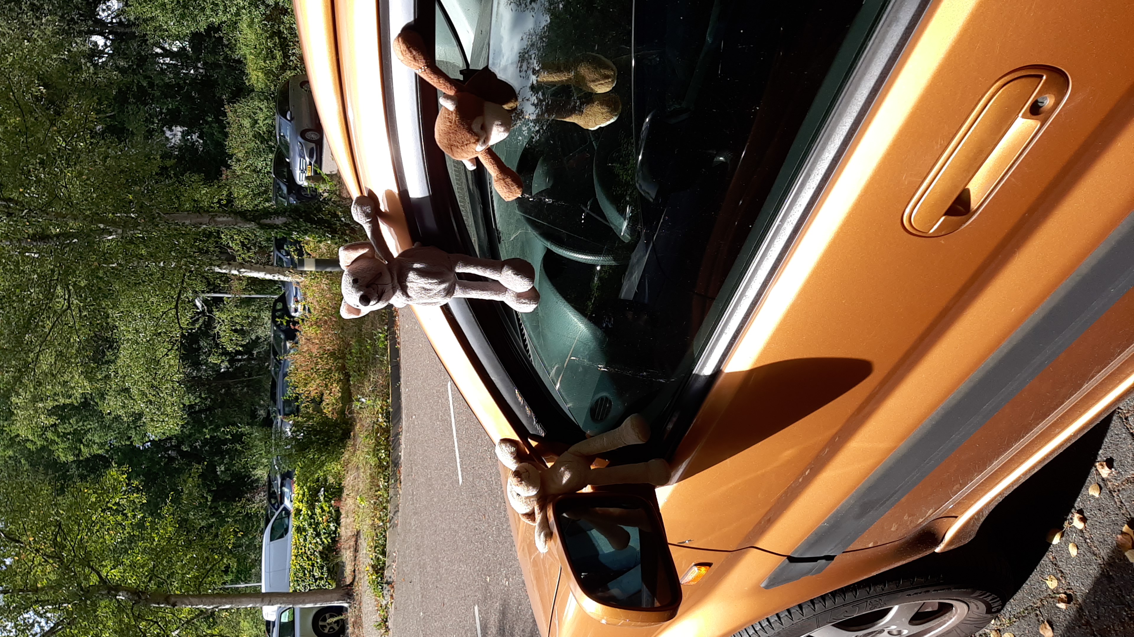 Alle knufs mogen een avondje met Ron 'Beton' op de camping. Ze wachten al in de auto en net als ik kom aanlopen, jawel zijn de rakkers eruit gevlogen. Althans bijna allemaal want ik ben net op tijd. Ze hebben het raampje een stukje open gekregen en proberen eruit te kruipen.